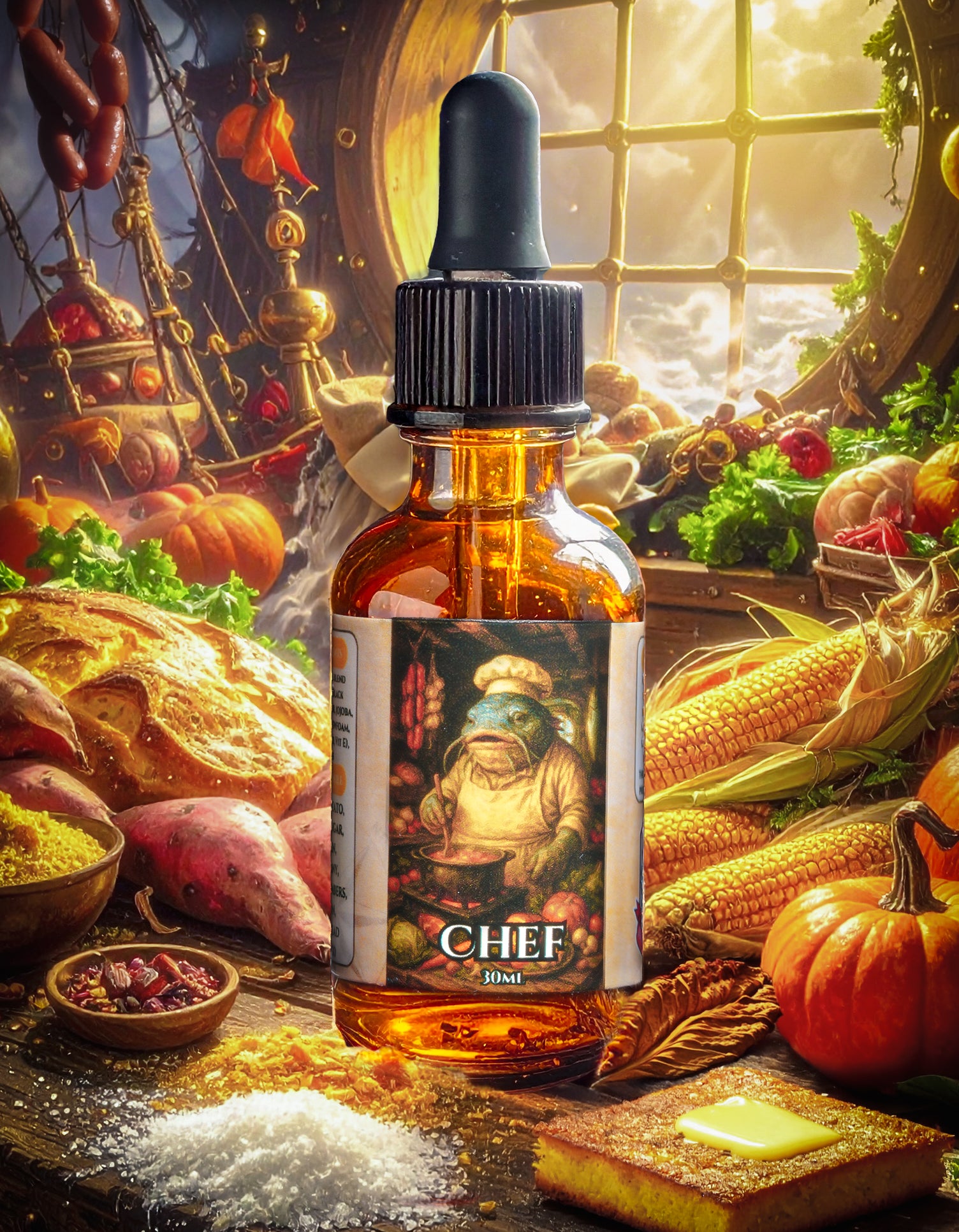Warm, sweet, smoky, and deeply comforting, Chef is a savory-gourmand feast — the aroma of a harvest meal slow-cooked over embers in the ship’s galley.