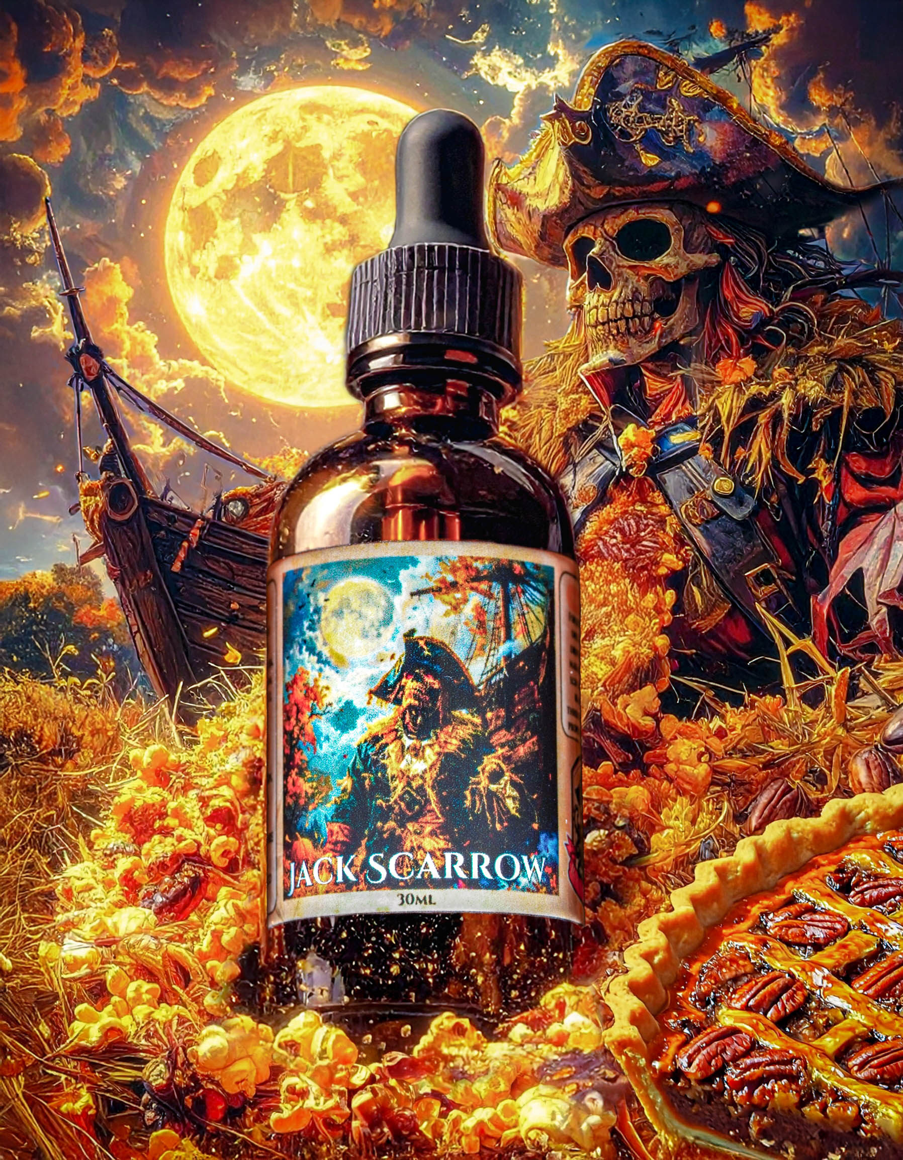 ✨ Overall Vibe: Jack Scarrow captures the haunted harvest of autumn — sweet and smoky, indulgent and eerie. It opens with carnival confections, moves through fields and feasts of the fall season, and lingers in a dark haze of campfire smoke and tobacco-amber, like a scarecrow standing watch in the pirate’s harvest night.