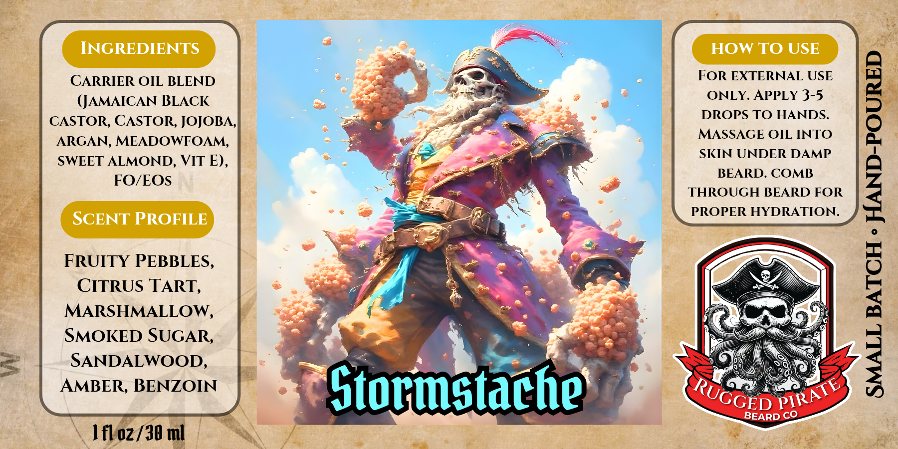 StormStache opens with a blast of bright cereal fruit, melts into fluffy marshmallow sweetness, and dries down warm, smooth, and slightly caramelized—like a pirate captain who replaced gunpowder with sugar storms.